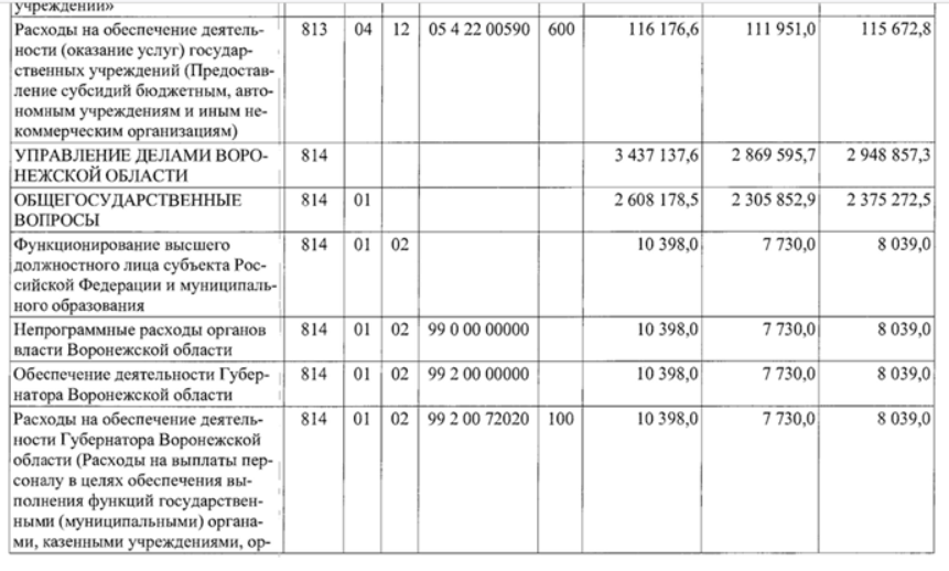 В Воронеже увеличили расходы на зарплаты губернатора и мэраВ разделах «Общегосударственные вопросы» областного и городского бюджетов есть подразделы «Функционирование высшего должностного лица субъекта федерации» (в случае с областью) и «Функционирование высшего должностного лица муниципального образования» (в случае с городом). Несмотря на название, по бюджетной классификации эти подразделы предусматривают расходы не на транспорт и не на покупку канцтоваров, а именно на различные выплаты губернатору и мэру — оклад, премии, отпускные, командировочные.