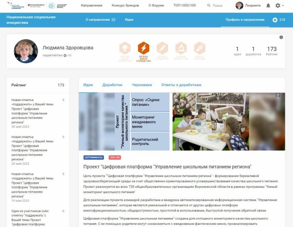 Бюро экспертного совета Агентства стратегических инициатив утвердило список топ-100 идей форума «Сильные идеи для нового времени», в который по направлению «Национальная социальная инициатива» включен проект по созданию механизма, позволяющего эффективно осуществлять контроль качества питания в школьных столовых за счет внедрения цифровой платформы «Управление школьным питанием». Предложенное решение позволяет повысить прозрачность работы, усилить контроль за качеством питания, а также создать удобный сервис получения обратной связи от родителей и обучающихся. Данный проект уже реализуется в школах Воронежской области с 1 сентября 2021 года и имеет большой потенциал.