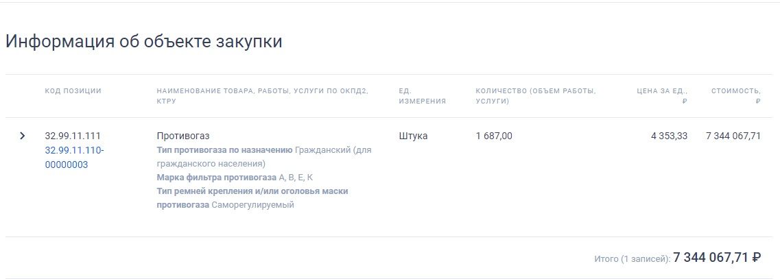 Также на сайте можно найти контракт от той же организации на закупку 18 200 фильтрующих противогазов. Её стоимость — 51 906 605 рублей, цена за одну штуку — 2 833 рубля.