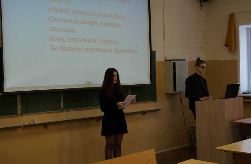Выступили студенты Роман Бруданин и Егор Поляков с докладами и презентациями. Состоялось обсуждение последствий оккупации для города Воронежа, героизме воинов-освободителей и жителей города.