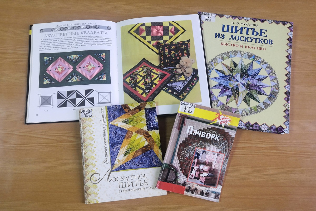Перед проведением мастер-класса зрителей познакомят с литературой по лоскутному шитью из фондов библиотеки. Это книги отечественных авторов, мастеров по лоскутной технике, а также переводные издания с немецкого и английского языков.