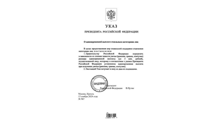 Президент Владимир Путин подписал указ о дифференциации выплат участникам специальной военной операции за полученные боевые ранения. Теперь размер выплаты будет зависеть от степени тяжести увечья – от 100 тысяч до 3 миллионов рублей.