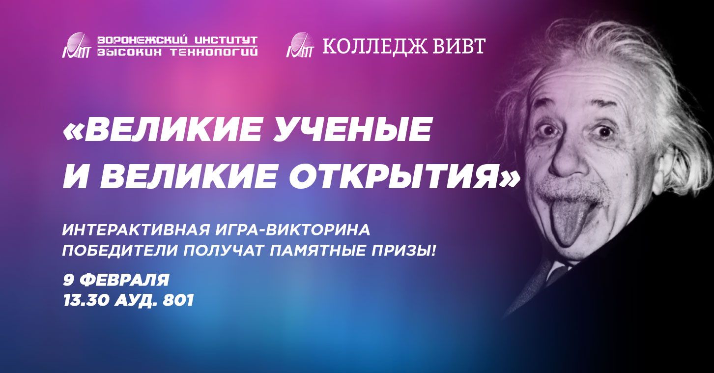 9 февраля в ВИВТ пройдет интерактивная игра-викторина "Великие ученые и великие открытия". Ждем вас в 13.30, ауд. 801. Участникам предстоит вспомнить изобретателей и их изобретения, интересные факты и открытия, изменившие мир.