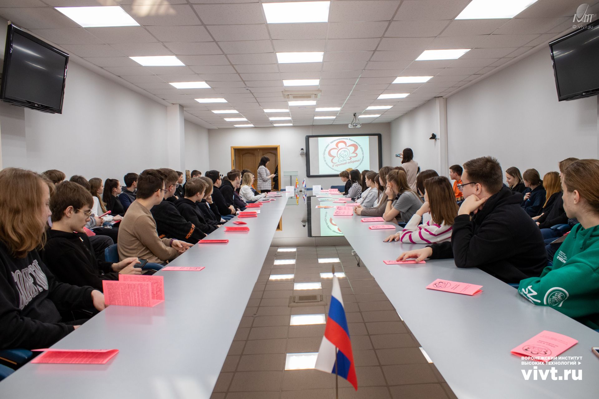 Спикерами были заведующая организационно-методическим отделом «Воронежского центра охраны здоровья семьи и репродукции» Елена Ивановна Щеголева и руководитель отдела по вопросам семьи, защиты материнства и детства Воронежской епархии, иерей Александр Александрович Шишкин. Они подготовили для студентов фильм и презентацию.