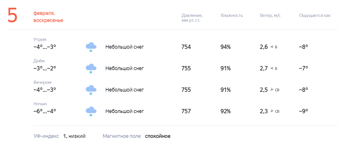Температура воздуха утром -4°…-3°, днем -3°…-2°, вечером -4°…-3°, ночью -6°…-4°.