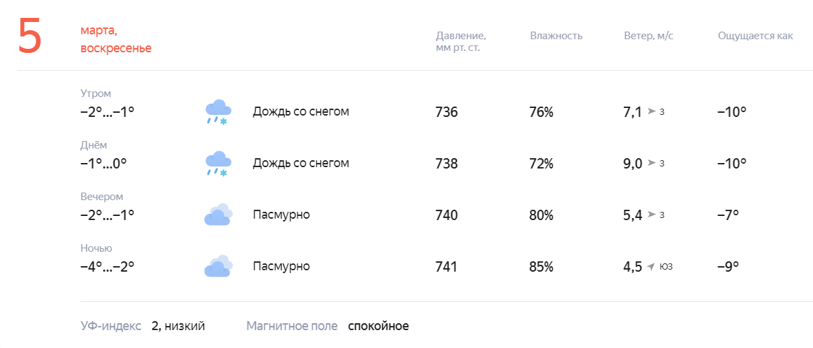Температура воздуха утром -2°…-1°, днем -1°…0°, вечером -2°…-1°, ночью -4°…-2°.