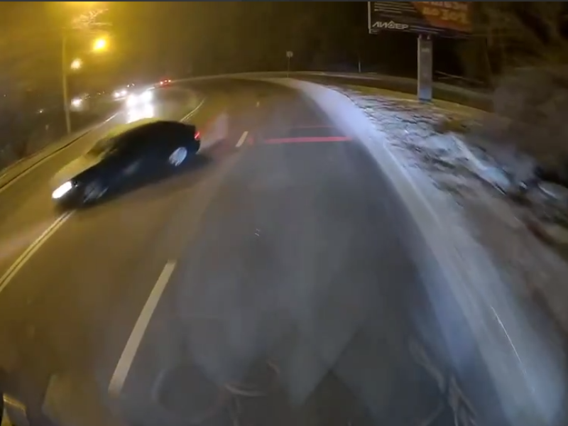 Машина развернуло, и она боком вошла в поворот. Только чудом автомобиль не попал под грузовик. Не врезался дрифтер и в других участников дорожного движения.