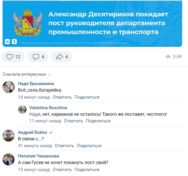 Воронежцы встретили гневными комментариями новость об увольнении Александра Десятирикова с поста главы департамента промышленности и транспорта региона. Правительство области опубликовало соответствующую новость в соцсетях, как подписчики начали ёрничать: