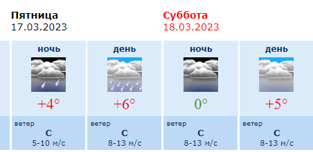 Фото: региональный ГидрометцентрВ ночь на субботу, 18 марта похолодает до +3-5 градусов, пройдёт небольшой дождь. Скорость ветра 5-10 м/с.