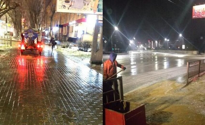 На борьбу с погодным явлением комбинаты благоустройства вышли незамедлительно, в целом по городу и на дорогах, и на тротуарах работало 156 единиц специализированной техники, израсходовано 427 тонн песко-соляной смеси.