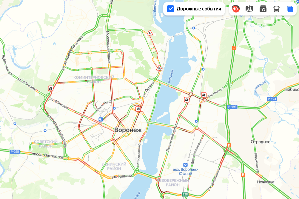 10-балльные пробки образовались на дорогах дождливого Воронежа вечером в четверг, 13 апреля.
