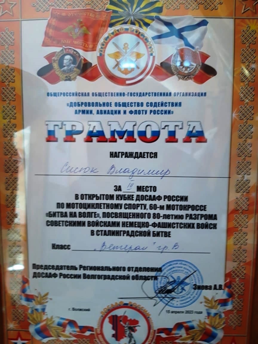 15 апреля в г. Волжском Волгоградской области мастер спорта России Владимир Сисюк занял 3-е место в открытом кубке ДОСААФ России по мотоциклетному спорту, 60-м мотокроссе «Битва на Волге», посвящённом 80-летию Сталинградской битвы, в классе «Ветераны, группа В». Поздравляем!