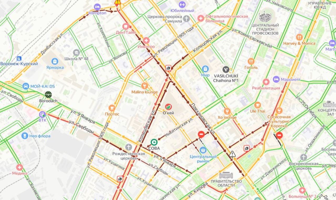 Сильнее всего загружены улицы Плехановская, Кольцовская, 9 Января, Никитинская, а также Донбасская