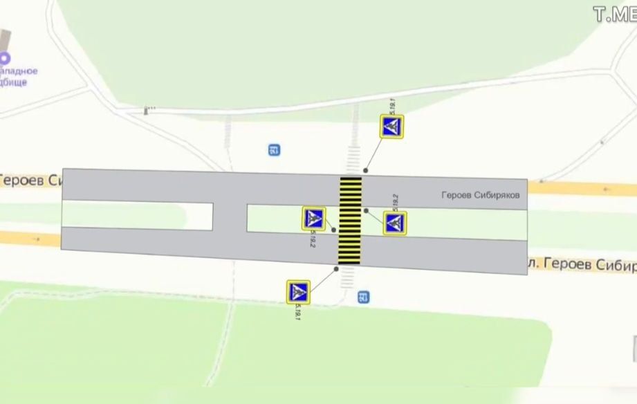 Переход обустроили на улице Героев Сибиряков. Теперь перейти дорогу по правилам получится у остановки общественного транспорта «Юго-Западное кладбище».