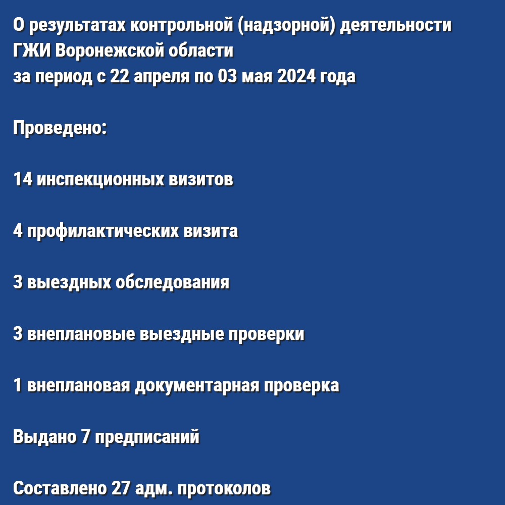 О результатах контрольной (надзорной) деятельности ГЖИ Воронежской области за период с 22 апреля по 03 мая 2024 года