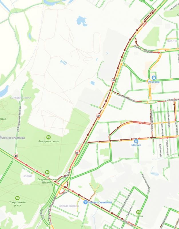 Серьёзные заторы также образовались на улицах 9 Января и 45-й Стрелковой дивизии. Сейчас в городе 7-балльные пробки.