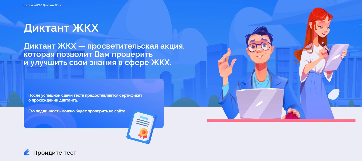 Пройти тест можно на портале «Школа ЖКХ» ( https://life.er.ru/dictation ). Он состоит из 30 вопросов по управлению многоквартирным домом, предоставлению услуг ЖКХ, защите прав потребителей в этой сфере. По итогам успешно пройденного теста каждый участник получит электронный сертификат. Один участник может пройти тестирование неограниченное количество раз.