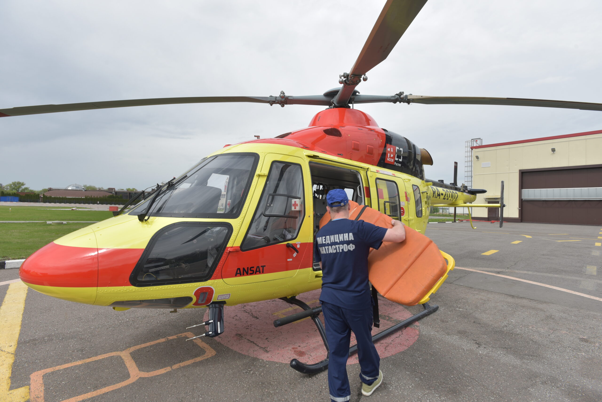 Воздушная скораяНа вертолётной площадке дожидается вызова вертолёт отечественной марки «Ансат». Выпускают эту машину в Казани, а название переводится с татарского как «простой, несложный». Крейсерская скорость вертолёта – 250 км/час, дальность полёта без дозаправки – 400 км. Внутри салон воздушной машины мало чем отличается от реанимобиля – место для больного, кресла для двух медработников и всё необходимое реанимационное оборудование, носилки, укладки с реанимационными наборами и лекарствами, баллоны с кислородом. Вертолёт используют для эвакуации пострадавших при ДТП, а также больных реанимационного профиля. Их доставляют из районных больниц в медицинские организации Воронежа – областные больницы для взрослых и детей, а также БСМП. В районных больницах есть посадочные площадки, а в крупных межрайонных центрах – посадочные площадки с возможностью приёма вертолётов в тёмное время суток. Из районов области пациентов эвакуируют на площадку в Воронеже, а затем доставляют в больницу на реанимобиле.