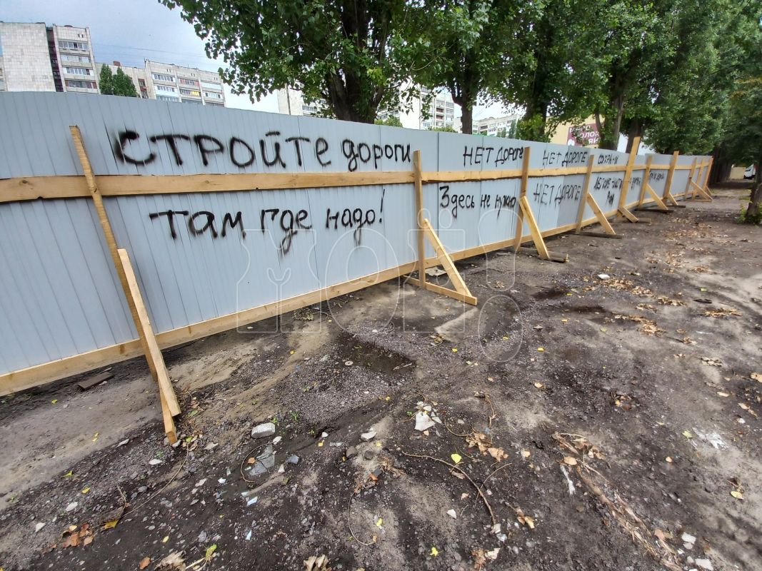 Ограждение поставили для расширения дорожного полотна на участке от улицы Генерала Лизюкова до Хользунова в рамках строительства дублёра Московского проспекта. Там на железных листах появились протестные надписи от местных жителей: «нет дороге», «сохраним лёгкие нашего района», «стройте дорогу там, где надо, — здесь не нужно». Так горожане выражают недовольство по поводу вырубки деревьев, которая необходима для строительства.