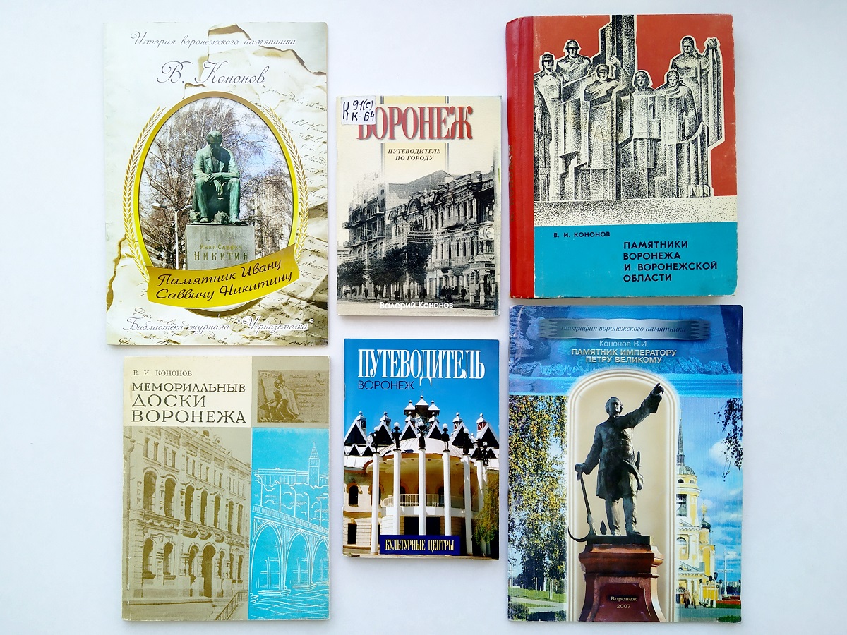 Выставка из цикла «Памятные даты Воронежского края» посвящена 90-летию со дня рождения Валерия Ивановича Кононова (23.07.1934–2.09.2018). Валерий Иванович – радиотехник, краевед, коллекционер, Заслуженный изобретатель РСФСР. Занимался темой изучения памятников и мемориальных досок Воронежской области. В разные годы В. И. Кононов был членом Воронежского историко-культурного общества, городской комиссии по историко-культурному наследию и областного экспертного совета по охране памятников истории и культуры. Был награждён премией по журналистике и книгоиздательству за книгу «Священная память: к 60-летию освобождения Воронежа от немецко-фашистских захватчиков» (2003) и знаком «За активную работу в Обществе охраны памятников истории и культуры». На выставке представлены книги, путеводители и брошюры В. И. Кононова: «Воронеж. История города в памятниках и мемориальных досках» (2005), «Воронеж. Путеводитель по городу: Наш город. Люди. События. Памятники. Архитектура» (2014) и другие.