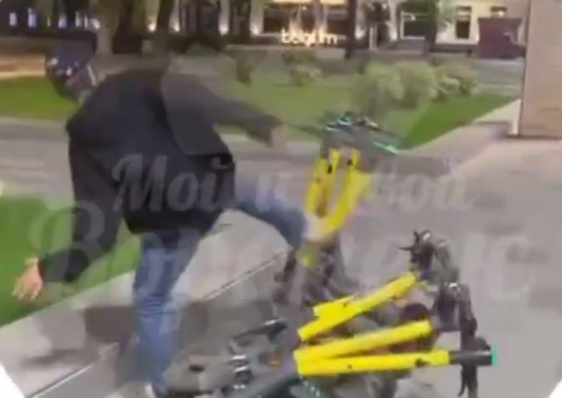 Одному из подростков помешали припаркованные транспортные средства. Мальчик с силой пнул стоящие самокаты, от чего они упали на землю.