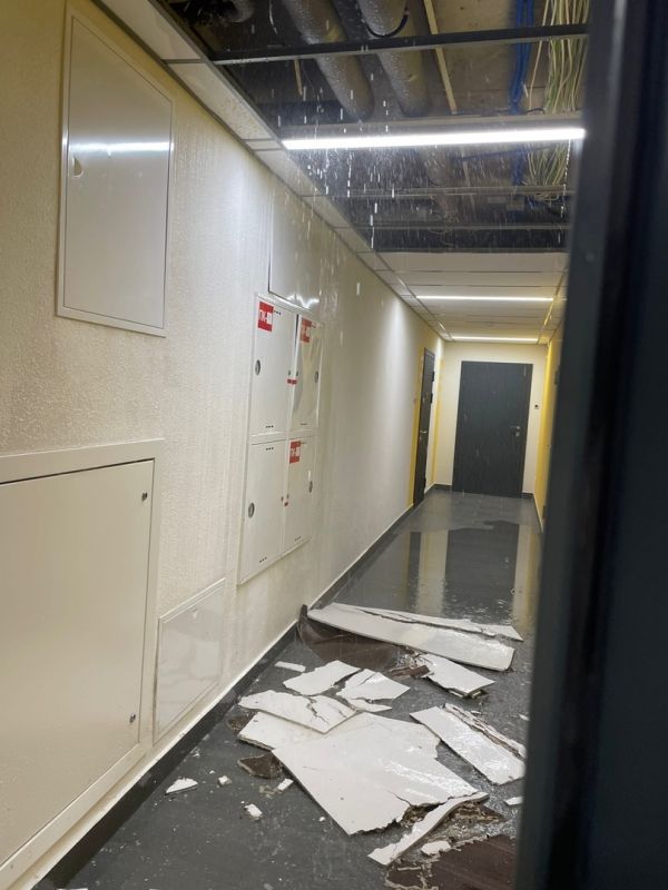 Татьяна показала нам последствия потопа на видео. На кадрах женщина сливает воду с коврика у входной двери в своей квартире, выходит в коридор и видит льющуюся дождём воду с труб на потолке и обломки, судя по всему, навесного потолка на полу.