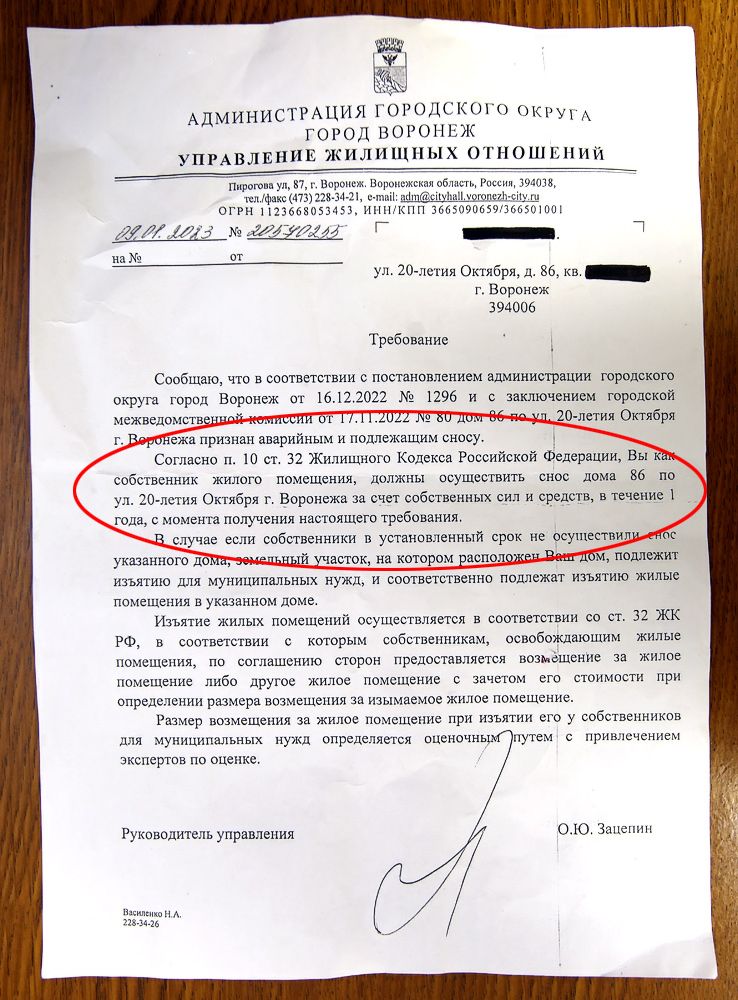 Фото: Игорь Филонов Фото: Игорь Филонов «Мы просто информируем жильцов»Потратив огромные деньги на капремонт здания, власти решили больше не тратиться и предложили жильцам самим демонтировать дом. Вы удивитесь, любимые читатели, но это прописано в законе. Если вы живёте в аварийном доме, то и вы вполне можете получить такое «письмо счастья». Орган, принявший решение о признании дома аварийным и подлежащим сносу/реконструкции, может предъявить к собственникам помещений в этом доме требование о его сносе/реконструкции. Если собственники в установленный срок не осуществили снос/реконструкцию дома, земельный участок, на котором расположен этот дом, а также все квартиры подлежат изъятию для муниципальных нужд (ч. 10 ст. 32 ЖК РФ).