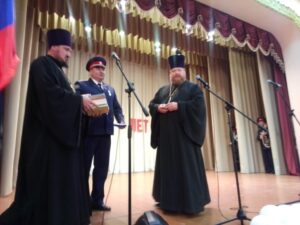 От духовенства епархии руководитель епархиального отдела по взаимодействию с казачеством протоиерей Владимир Шереметов поздравил кадет и преподавателей с 16 — летием со дня начала работы Верхнемамонского Матвея Платова казачьего кадетского корпуса. И вручил директору кадетского корпуса Сорокину Виктору Владимировичу юбилейную медаль к 120-летию храма Иоанна Богослова с.Гороховка. На торжественной части были переданы книги для библиотеки кадетского корпуса, которая теперь пополнилась духовной и классической литературой. В завершении участники мероприятия посмотрели праздничный концерт.