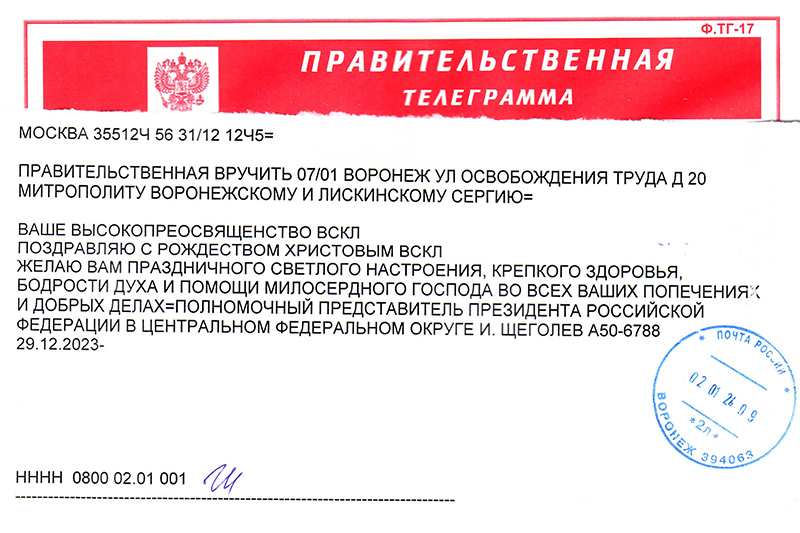 Правительственная телеграмма. МОСКВА ПРАВИТЕЛЬСТВЕННАЯ ВОРОНЕЖ УЛ ОСВОБОЖДЕНИЯ ТРУДА Д 20 МИТРОПОЛИТУ ВОРОНЕЖСКОМУ И ЛИСКИНСКОМУ СЕРГИЮ= ВАШЕ ВЫСОКОПРЕОСВЯЩЕНСТВО!