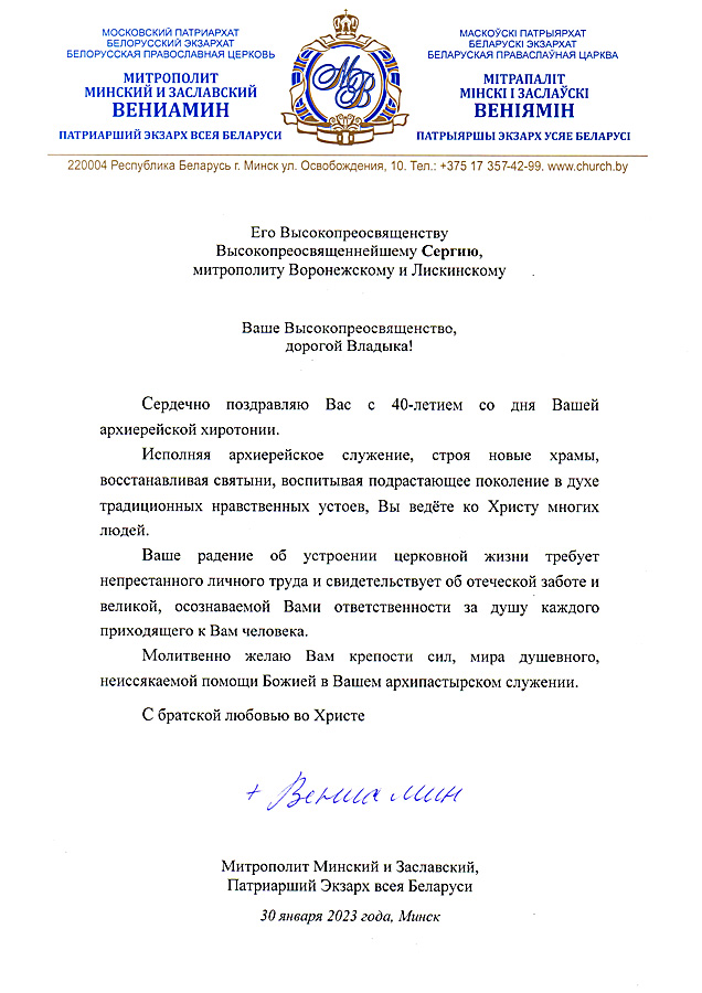 С 40-летием со дня архиерейской хиротонии митрополита Воронежского и Лискинского Сергия поздравил митрополит Минский и Заславский Вениамин, Патриарший Экзарх всея Беларуси