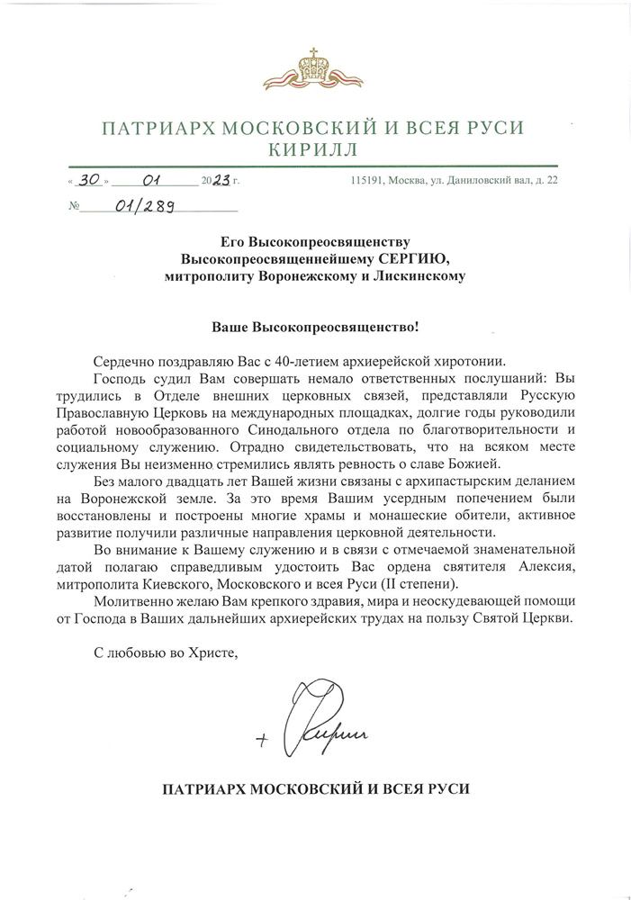 Святейший Патриарх Московский и всея Руси Кирилл поздравил митрополита Воронежского и Лискинского Сергия, главу Воронежской митрополии, с 40-летием архиерейской хиротонии