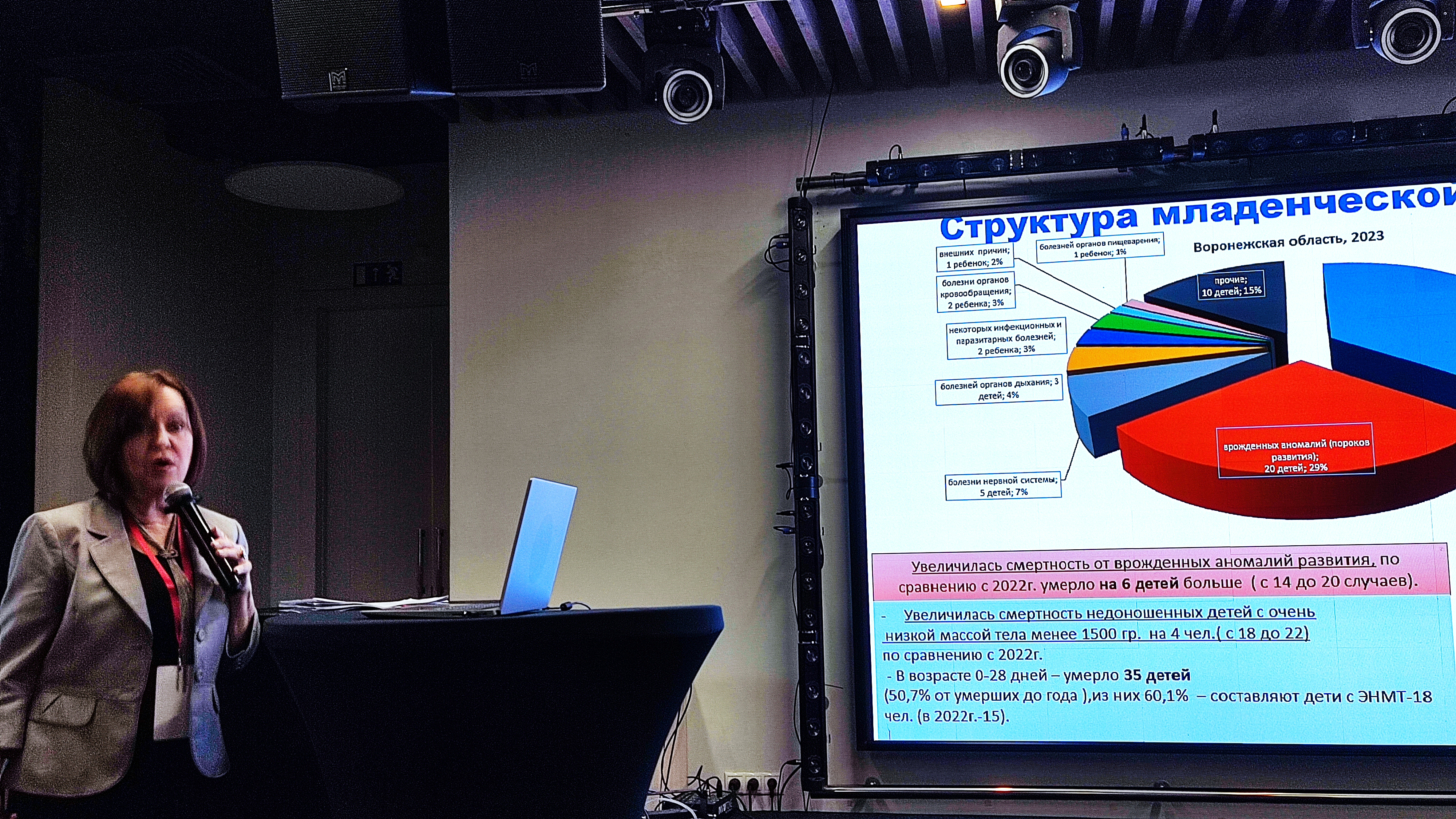 Обсуждаемые проблемы были актуальными для практической работы педиатров и включали несколько блоков. Первый блок был посвящен неотложной помощи. С первым докладом выступила главный внештатный педиатр Воронежской области М.М. Киньшина, которая проанализировала младенческую и детскую смертность в Воронежской области в 2023 г. и рассказала о задачах и путях её снижения в текущем году.