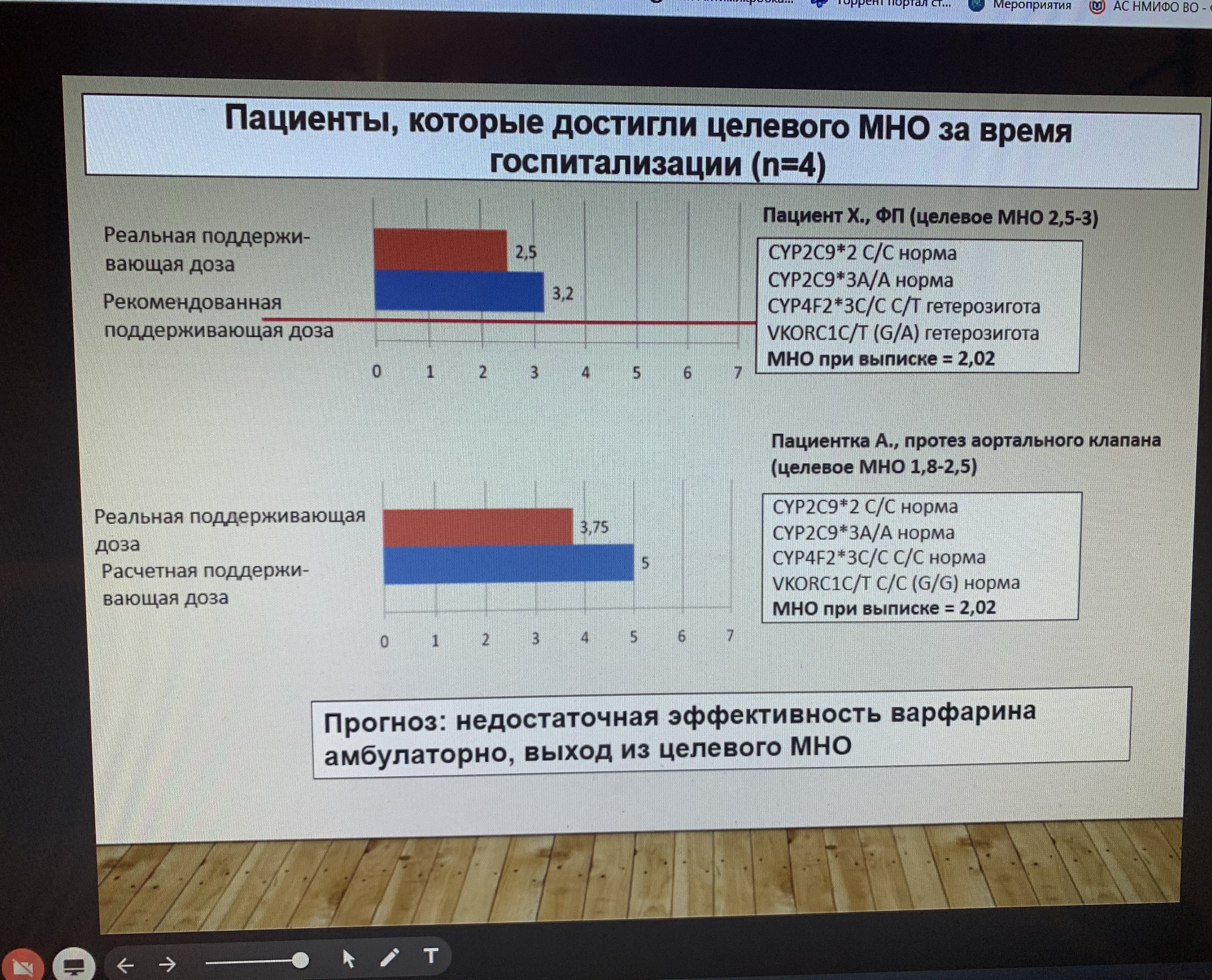 «Опыт использования системы поддержки принятия решений при назначении антикоагулянтов в многопрофильном стационаре». Докладчик: Чернов Антон Александрович – кандидат медицинских наук, научный сотрудник научно-исследовательского института молекулярной и персонализированной медицины ФГБОУ ДПО РМАНПО Минздрава России, врач клинический фармаколог отдела клинической фармакологии ГКБ №52 Департамента здравоохранения г. Москвы. «Роль антитромботической терапии в предотвращении повторных цереброваскулярных катастроф». Докладчик: Якусевич Владимир Валентинович – доктор медицинских наук, профессор кафедры клинической фармакологии ФГБОУ ВО «Ярославский государственный медицинский университет» Минздрава России, заслуженный врач РФ. «Рациональная фармакотерапия антитромботическими препаратами». Докладчик: Котельникова Татьяна Евгеньевна – кандидат медицинских наук, главный врач ЧУЗ «Клиническая больница «РЖД-Медицина» г. Воронеж», доцент кафедры производственной медицины ФГБОУ ВО «ВГМУ им. Н.Н. Бурденко» Минздрава России «Реальная практика назначения варфарина и персонализированный подход к режиму дозирования». Докладчик: Гончарова Наталия Юрьевна – кандидат медицинских наук, доцент кафедры клинической фармакологии ФГБОУ ВО «ВГМУ им. Н.Н. Бурденко» Минздрава России, врач клинический фармаколог БУЗ ВО «ВГКБ №3». «Безопасность применения дезагрегантов в современной клинической практике у пациентов кардиологического профиля». Докладчик: Дубровский Алексей Александрович – врач-клинический фармаколог БУЗ ВО «ВГКБ № 2 им К.В. Федяевского», ассистент и заочный аспирант кафедры клинической фармакологии ФГБОУ ВО «ВГМУ им. Н.Н. Бурденко» Минздрава России.В докладах были освещены теоретические аспекты применения антитромботических средств, результаты многоцентровых клинических исследований, практические аспекты применения антиагрегантов и антикоагулянтов в реальной клинической практике, возможности оценки эффективности и безопасности препаратов этих групп. Слушатели конференции проявили неподдельный интерес к обсуждаемым темам, задавали много вопросов. Оргкомитет конференции выражает искреннюю благодарность всем участникам и надеется на дальнейшее плодотворное сотрудничество.