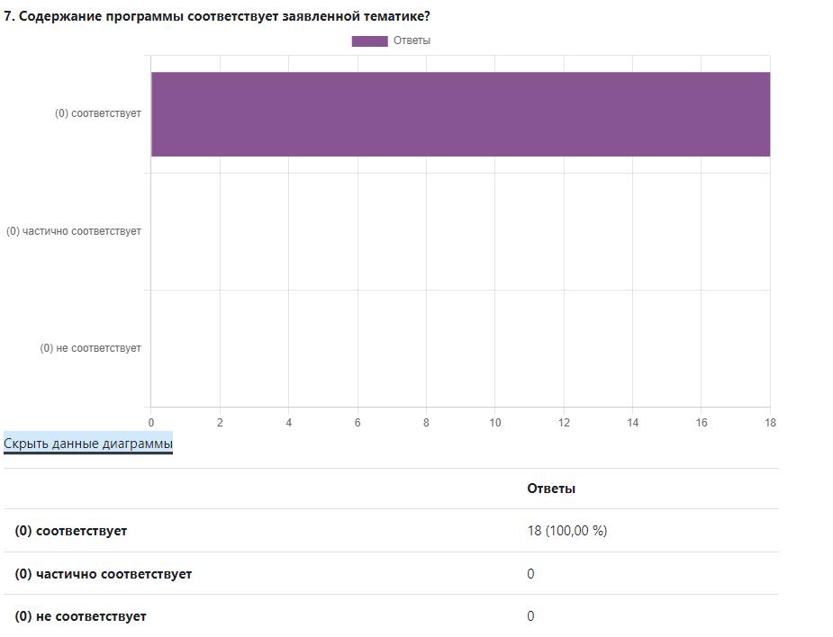 Слушатели высоко оценили организацию, актуальность, практическую значимость цикла, соответствие содержания программы заявленной тематики, о чем свидетельствуют данные анонимной анкеты «Оценка уровня удовлетворённости слушателей ИДПО ВГМУ им. Н.Н. Бурденко качеством обучения по дополнительным профессиональным программам», размещенной на платформе для дистанционного обучения «Электронное и дистанционное обучение врачей».
