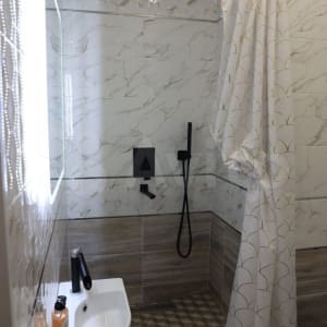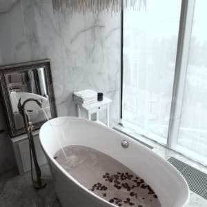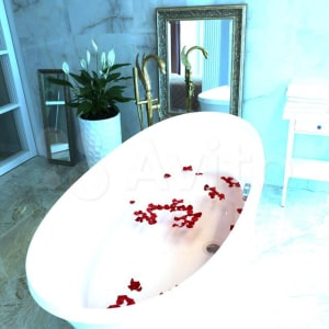 В оформлении интерьера сочетаются приглушенные оттенки летней зелени и цветов, напольное покрытие вызывает ассоциации с песчаным пляжем. Отдельностоящая ванна благородной каплевидной формы как напоминание о море. У нас есть даже собственное солнышко - оригинальная люстра с лучиками-цепочками с возможностью смены оттенка свечения! Живые растения. В душе можно устроить свой собственный маленький дождь - там установлена система Тропический душ со встроенной потолочной лейкой 40*40 см. Душ со светодиодной подсветкой, она меняет цвет в зависимости от температуры воды.